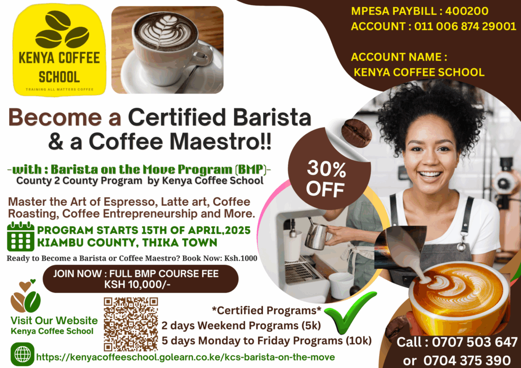 Barista Mtaani is a County to County grassroots youth empowerment initiative focused on specialty coffee skills, entrepreneurship, and job creation in local communities (Mtaani). It combines barista training, Coffee Roasting of Specialty Coffee, Value Addition at Origin, and business development to equip young people with employable skills and opportunities in Kenya’s growing coffee industry. (This is a not for profit program funded for – do good, feel good with an agenda of sustainability in Implementing SDGs in Kenyan Coffee, including access to education, skills around coffee circular economy and climate resilient coffee industry). All Courses are half funded Schorlaships as the usual fee is usually Ksh.35,000/- or more/.